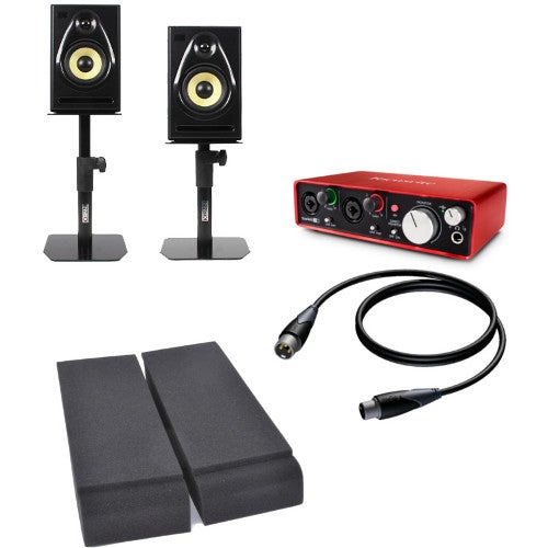 Audio interface: Een interface biedt merkbaar hogere geluidskwaliteit dan de audio-uitgang van je computer. Bij low-budget speakers kun je hem eventueel weglaten. Audiokabels: zie vraag 6. Statieven: Studiomonitors staan bij voorkeur op oorhoogte. Daarvoor kun je statieven gebruiken. Isolatie: Dit gebruik je om te voorkomen dat je bureau mee gaat trillen met het geluid van de monitors.