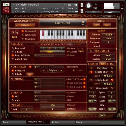 6. Heb ik legato-samples nodig?Gaat het om bijvoorbeeld blaasinstrumenten, strijkinstrumenten of vocalen? Dan is het antwoord: absoluut! Tenminste, als je een realistische klank wilt. Ga je bijvoorbeeld op een echt blaasinstrument vloeiend van de ene naar de andere noot, dan zul je namelijk altijd een overgang horen. Denk aan een 'aanloopje' in het volume, mechanische klepjes en andere bijgeluiden. Net als bij de round robins (zie vraag 5) was dit vroeger ondenkbaar, omdat legatotransities behoorlijk veel geheugen kosten. Een plugin met legato-samples herkent een legato-overgang automatisch wanneer je een bepaalde noot speelt terwijl de vorige noot nog klinkt. Een klein stukje overlapping dus. Er zal dan een specifiek transitie-sample worden 'afgespeeld'. Dit werkt vooral goed als je eenstemmig speelt en gebonden (dus geen ruimtes tussen de noten).