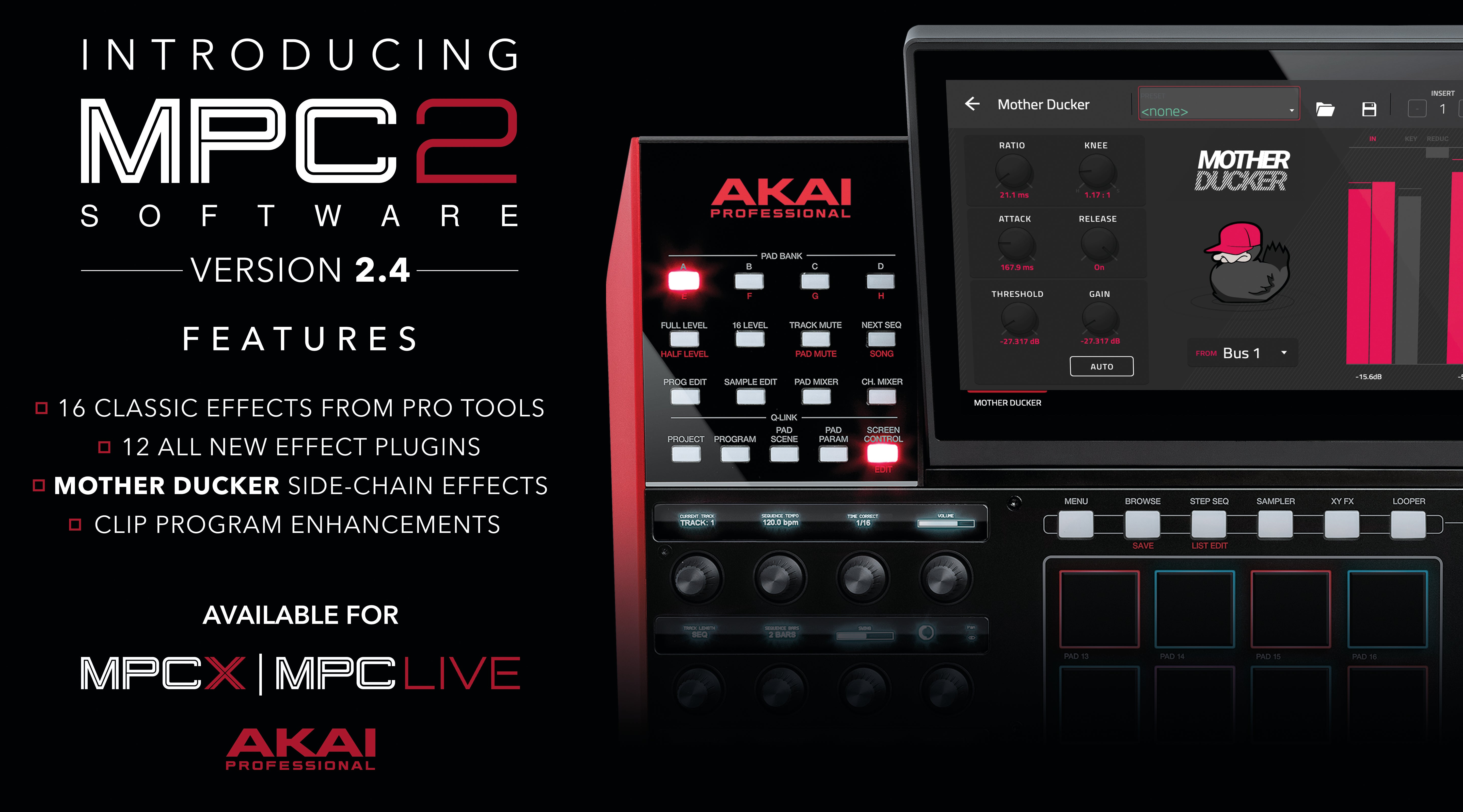 Naast een reeks andere producten heeft AKAI zojuist de MPC 2.4 aangekondigd. En het is precies waarop MPC-gebruikers gewacht hebben. Vol workflowverbeteringen en nieuwe door jullie zo graag geziene functies. Met name de toevoeging van maar liefst 28 ‘must-have’ effecten van DSP legendes AIR Music Technology doet menig hart sneller kloppen. Maar, de grootste toevoeging is toch wel de befaamde side-chain compressor: ‘the Mother Ducker’.