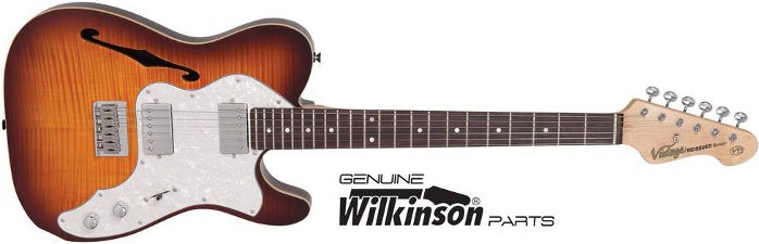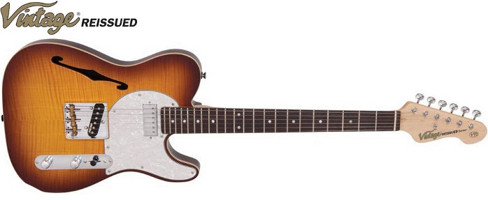 Vintage introduceert dit najaar de Vintage Reissued V72FTB en de Vintage Reissued V72HFTB. Twee semi-hollow TE-modellen in een vlammend jasje. ![]() Semi-traditioneel en geheel in stijl Een blik op beide nieuwe vintage gitaren maakt vrijwel gelijk duidelijk op welke periode ze geïnspireerd zijn. Ook de naam laat wat dat betreft weinig te raden over. Zowel de V72FTB als de V72HFTB brengen homage aan de semi-hollow TE modellen van begin jaren 70. De V72FTB is met zijn SH configuratie en vintage TE-stijl brug met drie messing zadels en klassieke toonregeling nog de meest traditionele van het stel. Tele-twang wordt geleverd door de Wilkinson Alnico single-coil bij de brug terwijl de Wilkinson mini-humbucker bij de brug een krachtig tegenwicht levert. Als tweede is er de V72HFTB met ditmaal twee full-size Wilkinson humbuckers en een 'moderne' '70s-style slagplaat. Beide instrumenten zijn door de uitgeholde body uitermate resonant en veelzijdig. De finishing touch komt in de vorm van een bijzonder fraaie top van gevlamd esdoornhouten fineer en de Tobacco Burst finish.