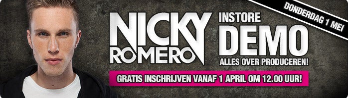Niemand minder dan Nicky Romero komt donderdag 1 mei naar onze muziekwinkel in Goes voor het geven van een demo over zijn werk als producer. De inschrijving voor dit evenement, waarvoor een beperkt aantal plaatsen beschikbaar is, is helaas gesloten.