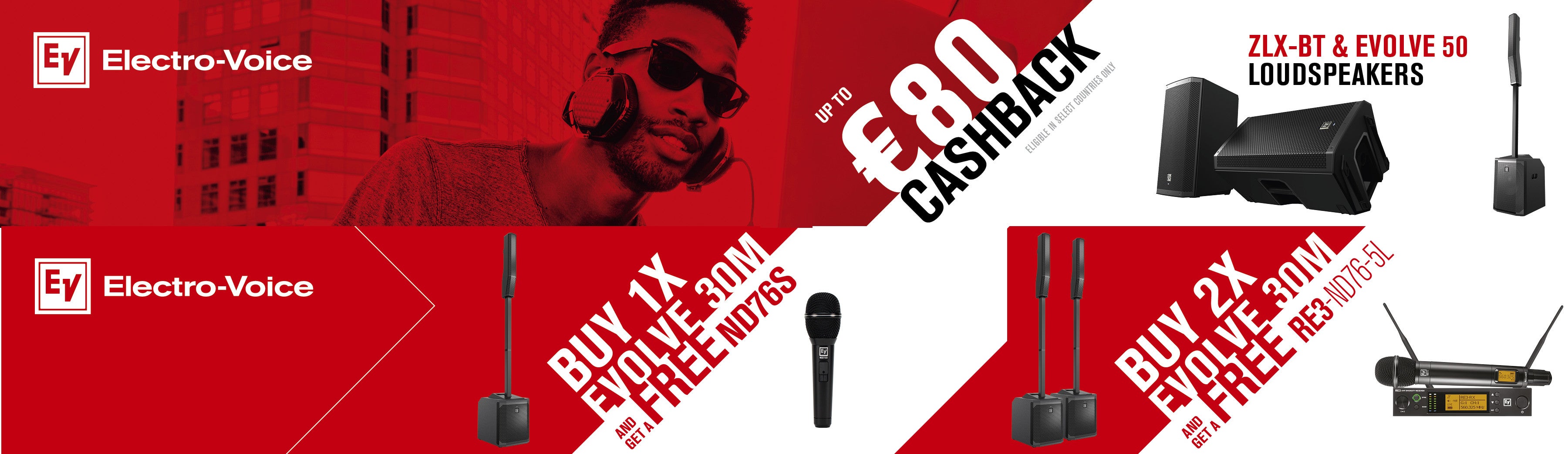 EV Cashback Promotie 1 april - 30 juni 2021Er zijn twee verschillende promoties tegelijkertijd gaande in deze periode. De eerste promotie heeft betrekking tot de EV ZLX-BT & Evolve 50 (zwart/wit) luidsprekers. Per luidspreker die koopt krijg je een geldbedrag teruggestort. Hiervoor is geen limiet per luidspreker! Per luidspreker zal je ook aan moeten kunnen tonen dat je deze bij ons hebt aangeschaft en persoonlijke gegevens moeten vermelden. Voor iedere ZLX-BT luidspreker krijg je een geldbedrag van €30,00 (of £25,00 in de UK) teruggestort, en voor ieder Evolve 50 systeem €80,00 (of £65,00 in de UK). Om je aankoop aan te melden moet je deze registreren op de volgende pagina: https://www.promo-ev.com/ , en gebruikmaken van de volgende actiecode: "21ZE" Voor meer informatie over deze promotie, klik dan hier. Wil je je aankoop bij Electro-Voice aanmelden, klik dan hier! De tweede promotie heeft betrekking tot het EV Evolve 30M speaker-zuilsysteem. Bij aankoop van één of twee van deze speaker-zuilsystemen krijg je een gratis microfoon(set) opgestuurd van Electro-Voice! Let er dus op dat je deze microfoon niet bij je bestelling krijgt maar dat deze achteraf wordt opgestuurd. Bij de aankoop van één Evolve 30M -systeem, zwart of wit, krijg je een EV ND76s microfoon. Bij aankoop van twee Evolve 30M-systemen krijg je een EV RE3-ND76-5L draadloos microfoonsysteem. Om je aankoop aan te melden moet je deze registreren op de volgende pagina: https://www.promo-ev.com/ , en gebruikmaken van de volgende actiecode: "E30M" Voor meer informatie over deze promotie, klik dan hier. Wil je je aankoop bij Electro-Voice aanmelden, klik dan hier! Over Aalbert TorsiusGerelateerde merkenGerelateerde producten |