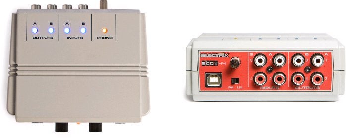 De Ebox-44 is een externe geluidskaart met aan de achterzijde vier RCA-ingangen en vier RCA-uitgangen. Tevens vinden we daar een line/phono-selector, waarmee u de phono-voorversterkers inschakelt. Een handige unit voor de DJ dus, die een serie draaitafels of tabletops met zijn PC of Mac wil verbinden. Aan de voorkant kunt u een microfooon en hoofdtelefoon inpluggen en afregelen.