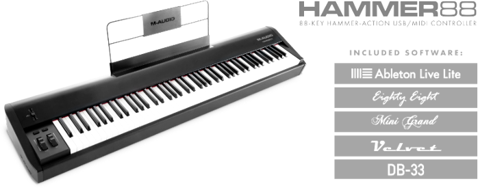 M-Audio brengt ons de Hammer 88; een volwaardig MIDI-klavier met 88 volledig gewogen toetsen. Je kunt nu eindelijk ervaren hoe een exclusieve concertpiano of -vleugel aanvoelt (en klinkt!). Maar dan voor een fractie van wat je neertelt voor de échte ervaring.