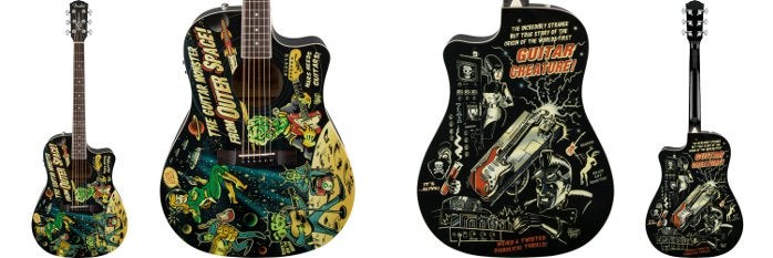 Last but not least is er de Vince Ray Outer Space T-Bucket. De T-Bucket is reeds sinds lange tijd een vaste waarde in het Fender assortiment. Deze elektrisch akoestische western gitaren heeft een compacte body en is voorzien van een Fishman Isys III pre-amp. Cult-Artiest Vince Ray heeft al eerder zijn creativiteit botgevierd op een T-bucket model maar deze keer is helemaal flink losgegaan! Het resultaat is deze vince Ray Outer Space. Freaky Hot Rod-stijl graphics met ruimtevaart en aliens als thema.