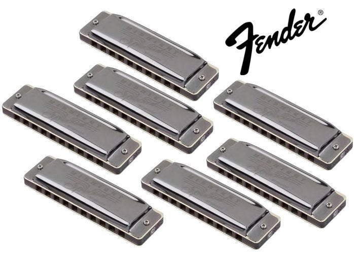 Fender Midnight Special: diatonische mondharmonica'sIn deze nieuwe serie vinden we zeven diatonische mondharmonica's. De mondharmonica's zijn voorzien van zwart verchroomde dekplaten aan de boven- en onderkant. Daartussen bevindt zich een houten kam. Deze kam is vochtwerend en zorgt voor een stabiele stemming. Mondharmonica's met houten kammen zijn doorgaans minder geschikt voor de echte beginner. De roestvrijstalen tongen hebben een breedte van 0.4 mm en klinken strak en helder. Deze harmonica's hebben een flink volumebereik en zijn in staat fraaie boventonen te produceren. Er zijn harmonica's beschikbaar in de toonsoorten C, G, A, D, F, E en Bb. Het volgende schema toont de beschikbare toonsoorten en ladders.