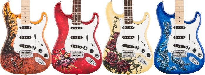 MN met vier verschillende afbeeldingen van kunstenaar en illustrator David Lozeau: Lozeau haalt zijn inspiratie uit punk, metal, en rockabilly muziek en underground subculturen zoals de tattoo- en hotrod- wereld. Zijn werk behoort tot de zogenaamde 'Low Brow' beweging die zich verzet tegen het snobisme van de gevestigde kunstcultuur. Als basis is dan ook de welbekende en vriendelijk geprijsde Standard Strat genomen. Dit is helemaal in de geest van de Low-Brow beweging want hierdoor blijven de vier kunstwerken gewoon bereikbaar voor een groot publiek. U heeft de keuze uit de Tree of Life of de Dragon Stratocaster (beide met esdoorn toets). Als u liever een model met een palissander toets zijn er de de Sacred Heart- en Rose Tattoo Stratocaster Let wel, deze vijf kunstwerkjes mogen dan betaalbaar zijn, ze zijn ook zeer exclusief. Per model worden er wereldwijd slechts 500 exemplaren van gemaakt. Als u gecharmeerd bent van deze unieke gitaren zult u dus wel snel moeten beslissen.