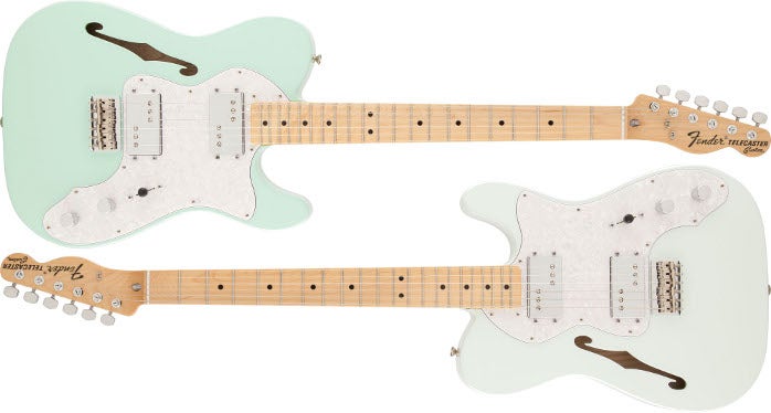 Als Fender nieuwe Special Editions uitbrengt mag de Telecaster natuurlijk niet ontbreken. Dit jaar komen ze in de vorm van de Limited Edition '72 Thinline Tele in Faded Sonic Blue of Surf Green. Zoals de naam al doet vermoeden zijn bij deze fraai uitgevoerde Teles de specificaties van het Thinline moel uit begin jaren 70 gevolgd. Dit is onder andere te zien aan de 'bullet-style' trekstang en de Fender F-style stemmechanieken. De recent aangepaste Fender Wide Range Humbuckers koppelen de rijke cleane sound van single-coil elementen aan de warmte en hogere output van humbuckers. Deze twee teles zijn dus zowel een lust voor het oog als voor het oor.