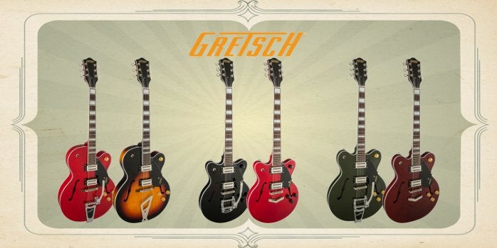 Heftige Hollow BodiesAls eerste uit de reeks zijn er de Gretsch G2420 en G2420T modellen. Dit zijn volledige hollow body gitaren waarvan het bovenblad is verstevigd middels parallelle zangbalken. De G2420T is voorzien van een Licensed Bigsby B60 tremolo en verkrijgbaar in een ingetogen Gold Dust uitvoering of in een bijzonder fraaie Flagstaf Sunset finish. Bij de G2420 in Brooklyn Burst uitvoering is de Bigsby achterwege gelaten en vervangen door een Gretsch staartstuk. Dikke double cutsDe Gretsch G2622, G2622T en G2622LH double cut modellen zijn alle drie behoorlijk uit de kluiten gewassen. In dit geval wordt het rondzingen van de klankkast tegengegaan door middel van een zogenaamd center block. De G2622T is verkrijgbaar in stijlvolle Torino Green uitvoering en wederom in de wonderschone Flagstaf Sunset finish. Bij de G2622 met vaste brug is gekozen voor een Walnut Stain afwerking. Ook aan de linkshandige rocker is gedacht middels de G2622LH. Junior SuperiorVoor wie de G2622 modellen ietwat te groot vindt zijn de G2655 Streamliners wellicht beter geschikt. Met alle flair van hun grotere familielid, maar dan een stukje bescheidener van formaat. De G2655 is verkrijgbaar met Bigsby B60 in de vorm van de G2655T Streamliner Walnut Stain of als de G2655T Streamliner Black. Bij de G2655 zonder vibrato Unit is gekozen voor de Flagstaff Sunset Finish.