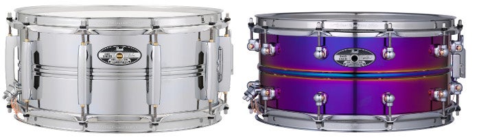 Zowel Eric Singer (KISS) en Omar Hakim zijn al 30 jaar trouwe endorsers van Pearl. Tijd om ze te belonen met een speciale 30th Anniversary snaredrum. De ES1465S van Singer heeft een formaat van 14 x 6.5 inch en is gebaseerd op het oude Pearl Jupiter model. Dat betekent een ketel van messing voorzien van een chromen coating. Maar natuurlijk wel voorzien van de nieuwste ketelhardware. Aan het uiterlijk van de OH1465S van Hakim kun je al zien dat hij bijzonder is. Ook deze heeft een formaat van 14 x 6.5 inch, maar is gemaakt van staal. Dat staal heeft via een chemisch proces een laag van titanium nitride gekregen. Hierdoor kan de kleur die je waarneemt veranderen, met de hoek waaruit je de snaredrum ziet.