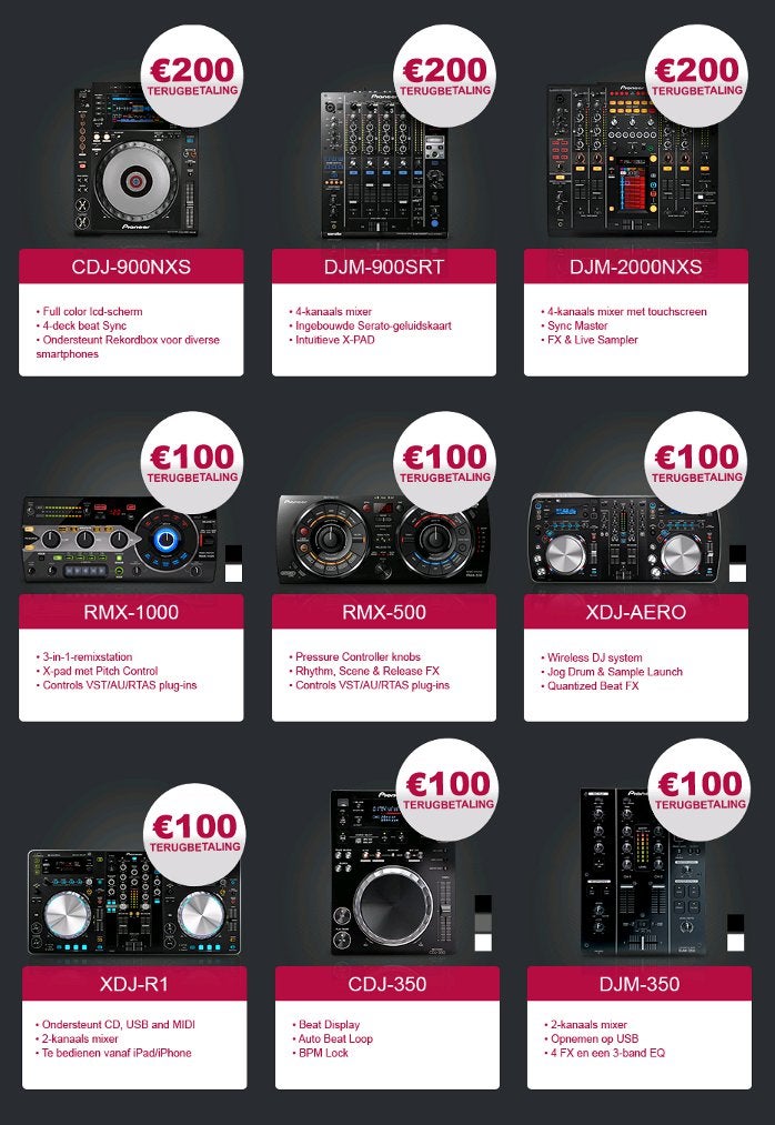 Oude productenAlle Europese edities en uitvoeringen van de volgende producten kunnen worden ingeruild: CDJ-1000 Nieuwe productenBij aankoop (binnen de actieperiode) van een van de volgende modellen hebt u recht op cashback: