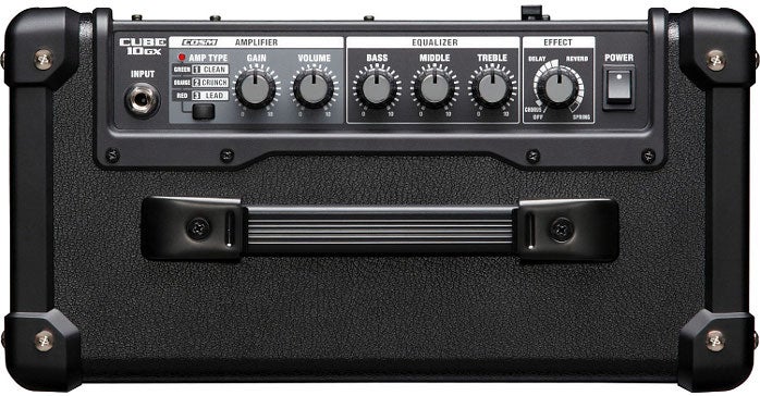 De gebruiksvriendelijke Cube-10GXDe Roland Cube-10GX is een 10 Watt gitaarversterker met een 8-inch luidspreker. Zo op het eerste gezicht oogt hij gelijk aan de Cube-20GX. Zijn bedieningspaneel is echter flink opgeschoond waardoor hij nóg gebruiksvriendelijker is. Links vindt u een knop waarmee u kunt schakelen tussen de drie voorgeprogrammeerde geluiden: clean, crunch en lead. Deze maken gebruik van Roland's legendarische COSM-technologie. Voor het afstellen van het geluid hebt u de beschikking over een gain- en volumeregeling plus een 3-bands equalizer. Rechts op het paneel vindt u de effectknop, waarmee u kunt kiezen uit drie onboard-effecten: chorus, delay en reverb (spring of plate).