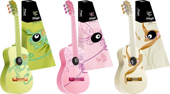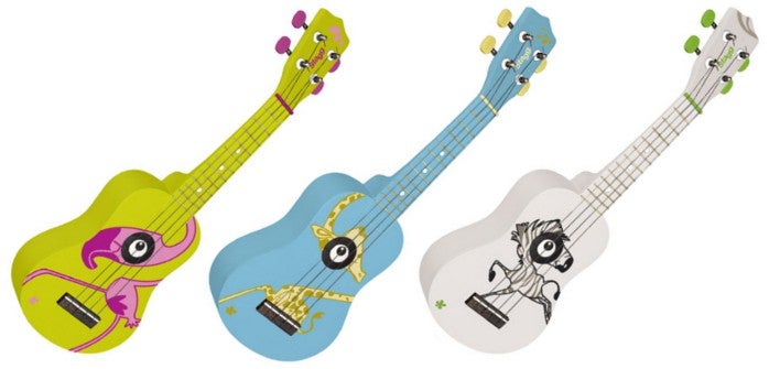 Ook vrolijke snaarinstrumenten zijn ontbreken niet, want deze zijn natuurlijk veel leuker dan die saaie dure gitaren die grote mensen kopen! De C505, C510 en C530 zijn gitaren in diverse formaten. De looks zijn respectievelijk kameleon, libelle en aap. Over dat laatste beest: u weet dat Een Aap Die Geen Bananen Eet een ezelsbruggetje is voor de stemming van de snaren?