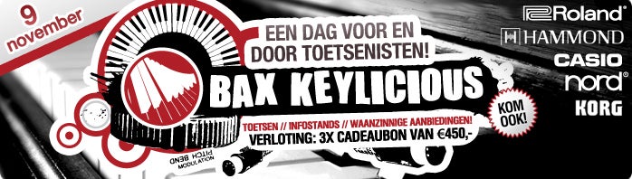 Kans op een cadeaubon van € 450,-!Onder alle bezoekers van de Bax Keylicious verloten we op de dag zelf drie keer een cadeaubon van € 450,-! Inschrijven Bax Keylicious gaat op zaterdag 9 november om 11.00 uur van start en zal tot ongeveer 16.00 uur duren. Graag tot ziens in onze muziekwinkel in Goes! Gerelateerde merkenGeen reactiesEr zijn nog geen reacties geplaatst.